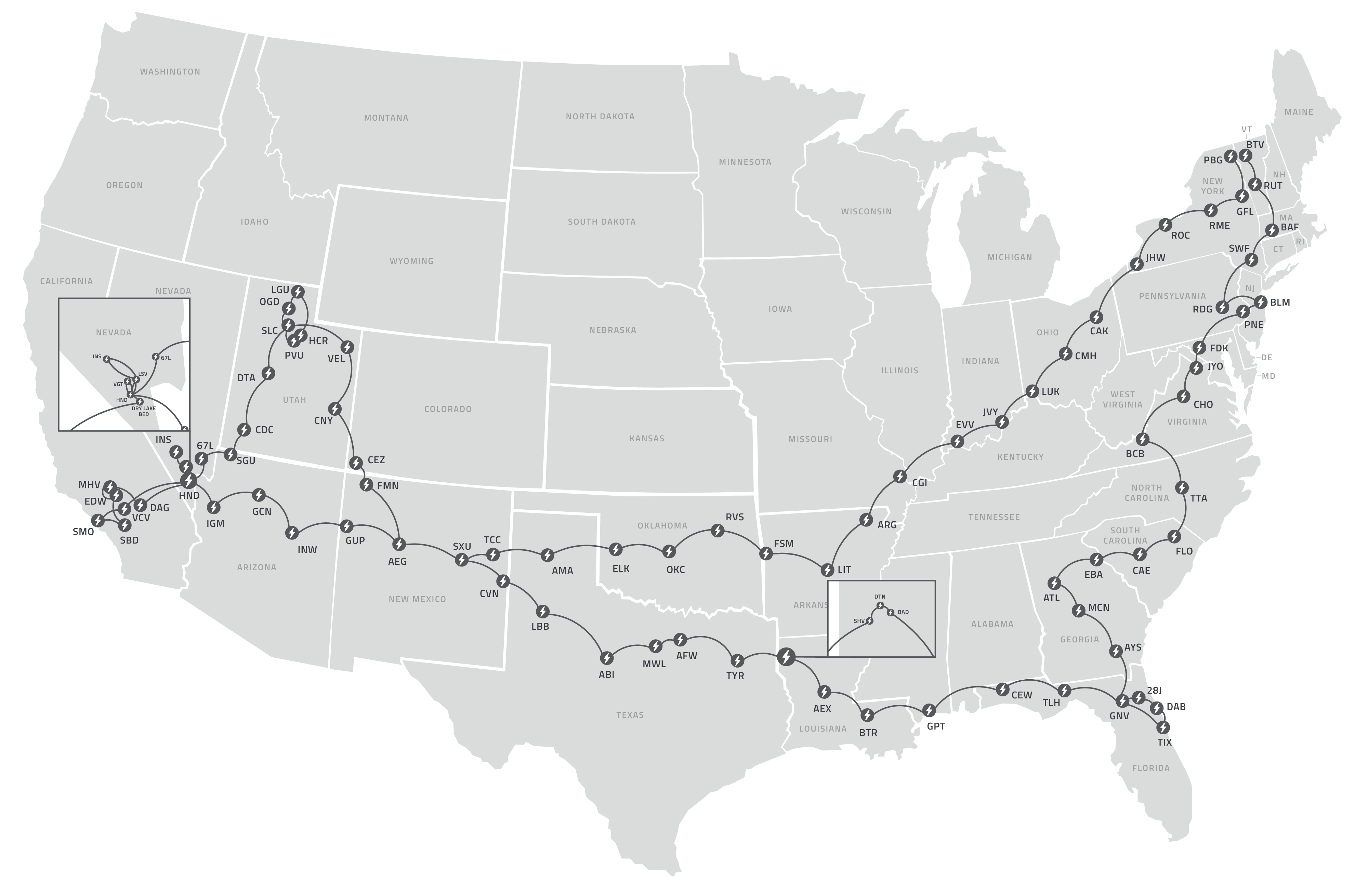Most of the 25 states we flew through were met by a barebones crew. Often times,  an ALIA pilot would touch down at airports across the country with no ground team waiting. In places beyond our ever-expanding charge network, our charge truck would eventually catch up to support the mission in the background.